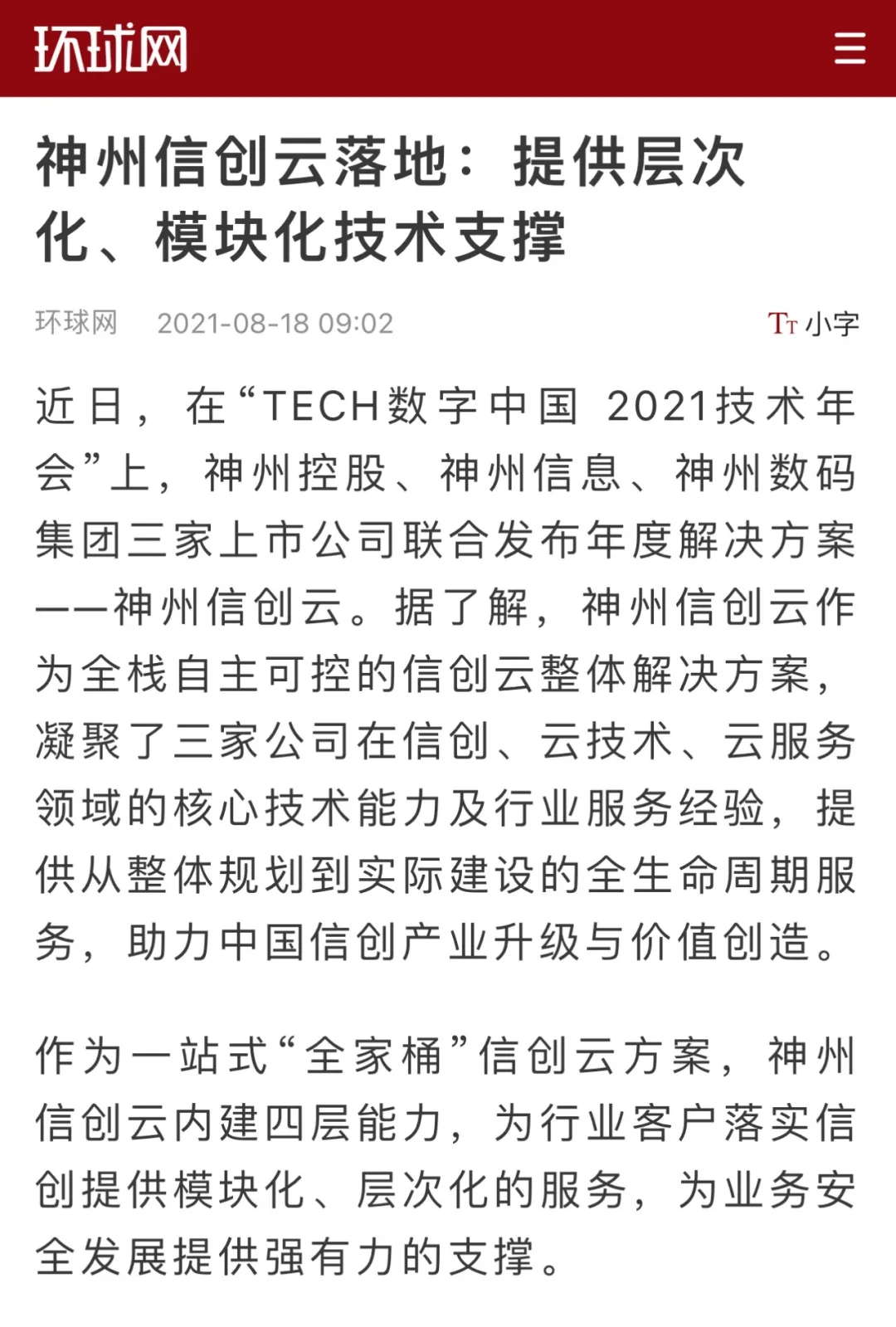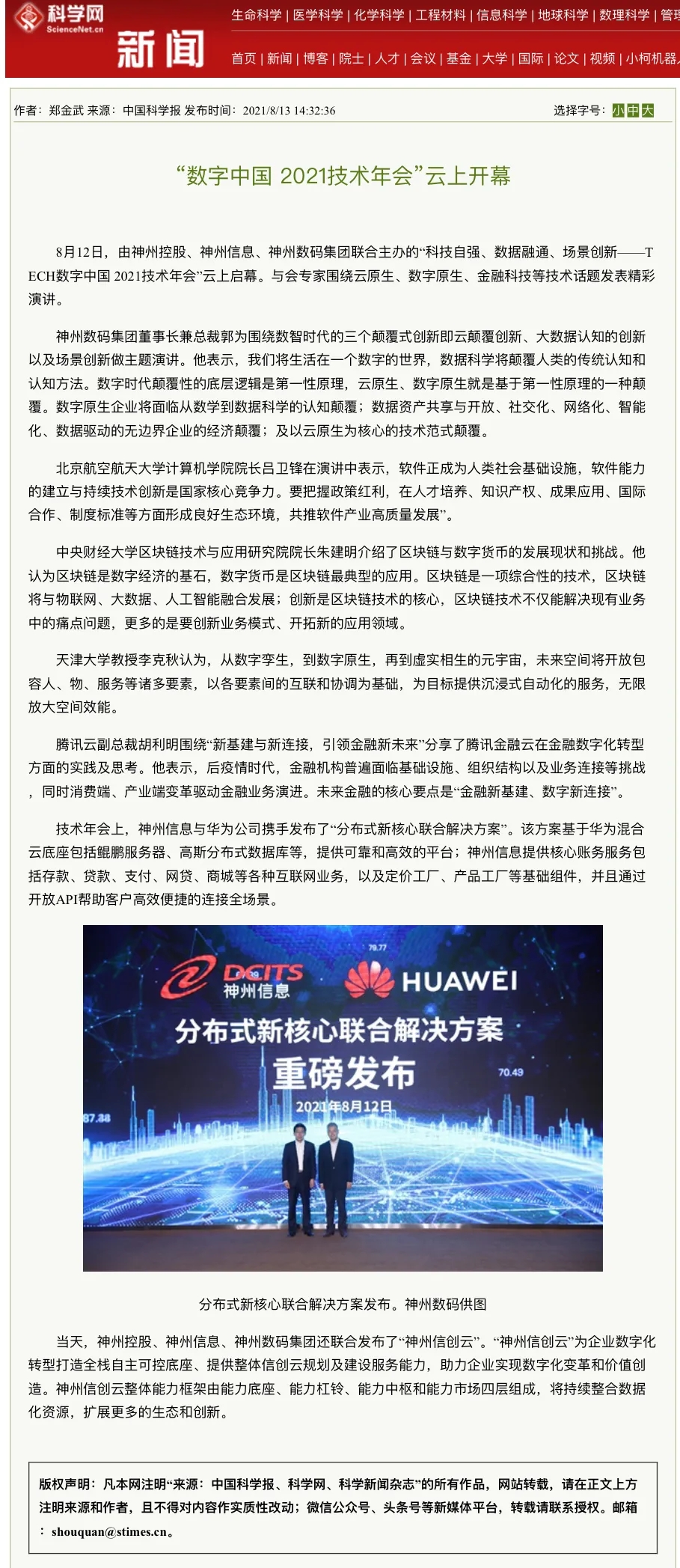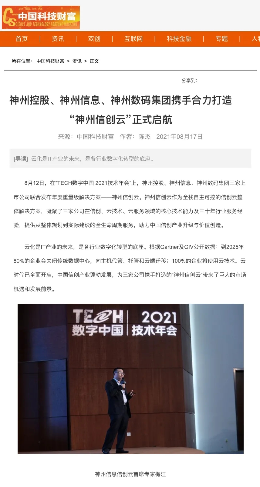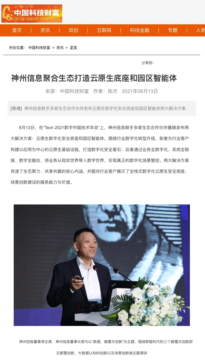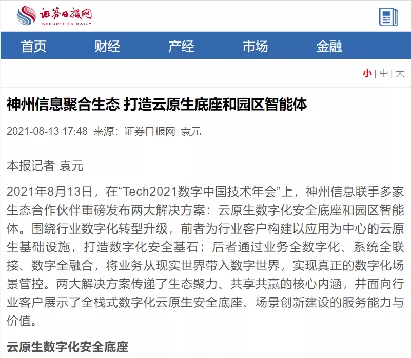 8月12日,由神州控股、神州信息、星空xingkong集团联合主办的“科技自强、数据融通、场景创新——TECH数字中国 2021技术年会”云上盛大启幕,发布神州信创云、ModelB@nk5.0、金融超脑Sm@rtFSB、云原生数字化安全底座、园区智能体等重磅产品,国内各大权威、影响力媒体多角度多频次对盛况进行报道!