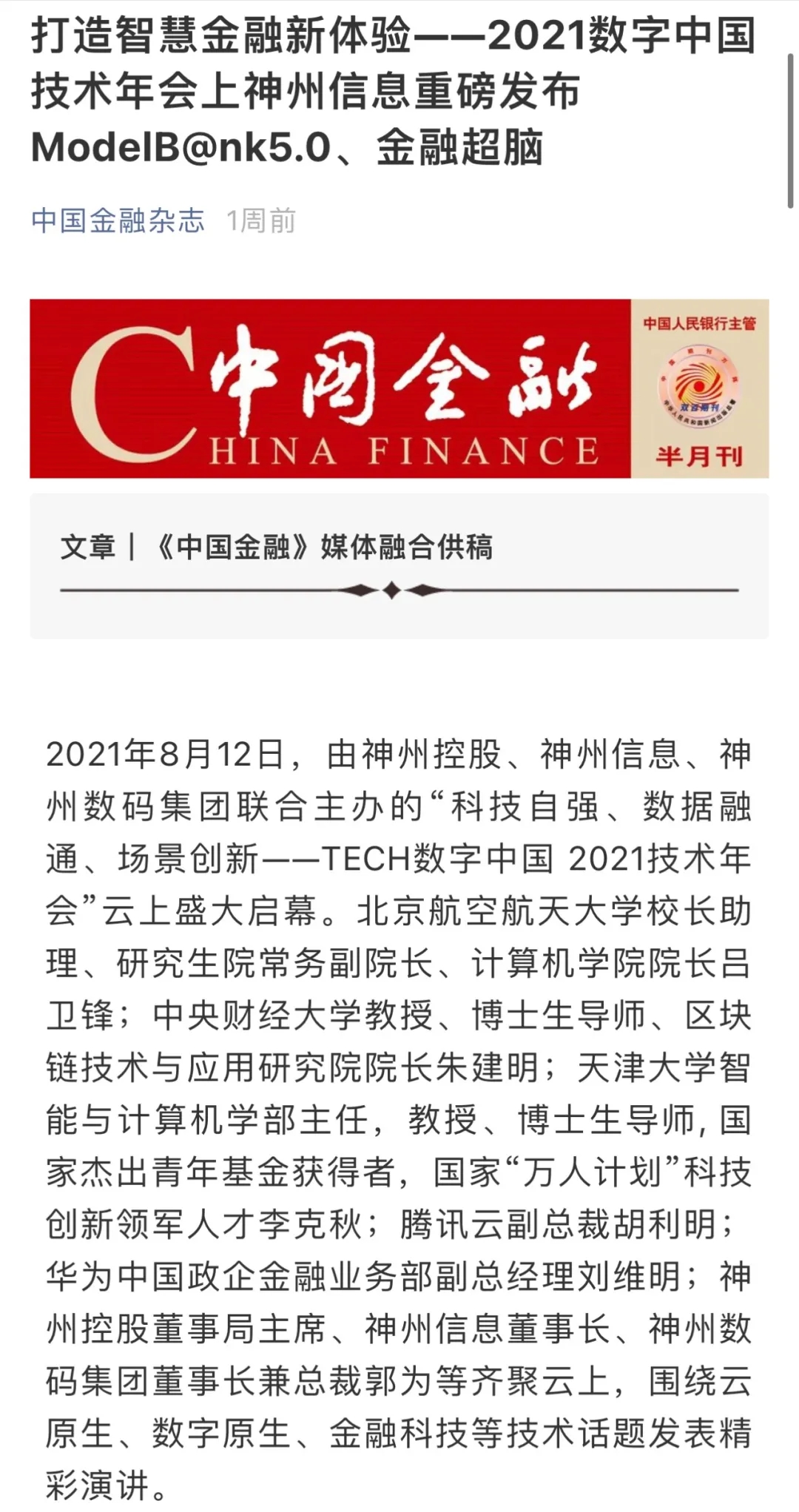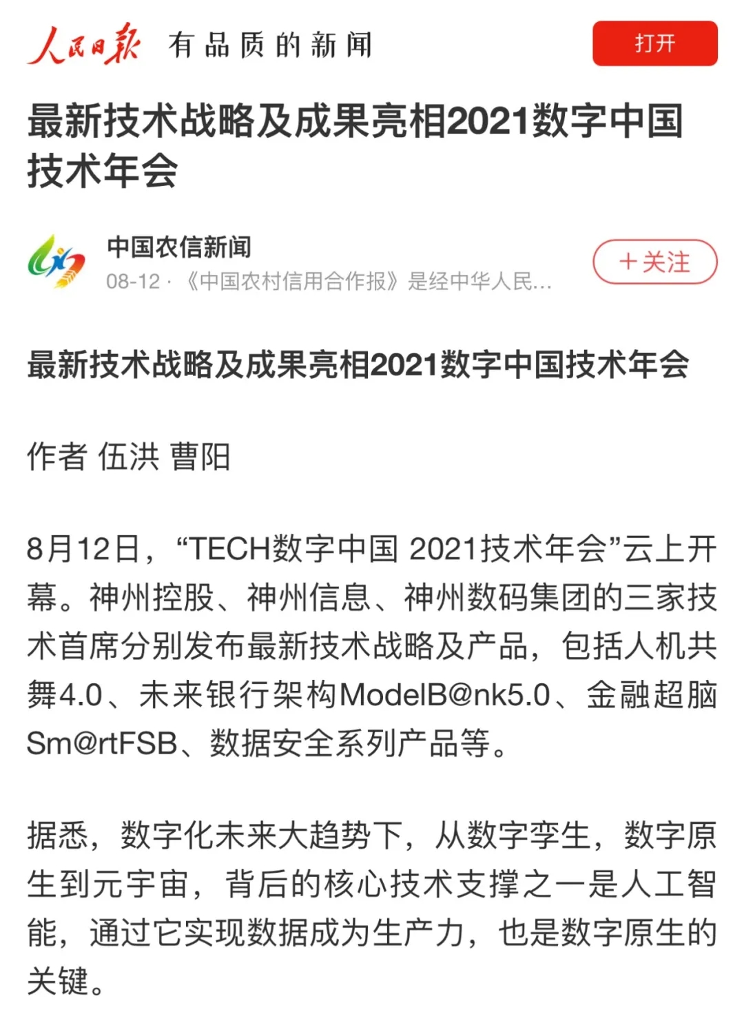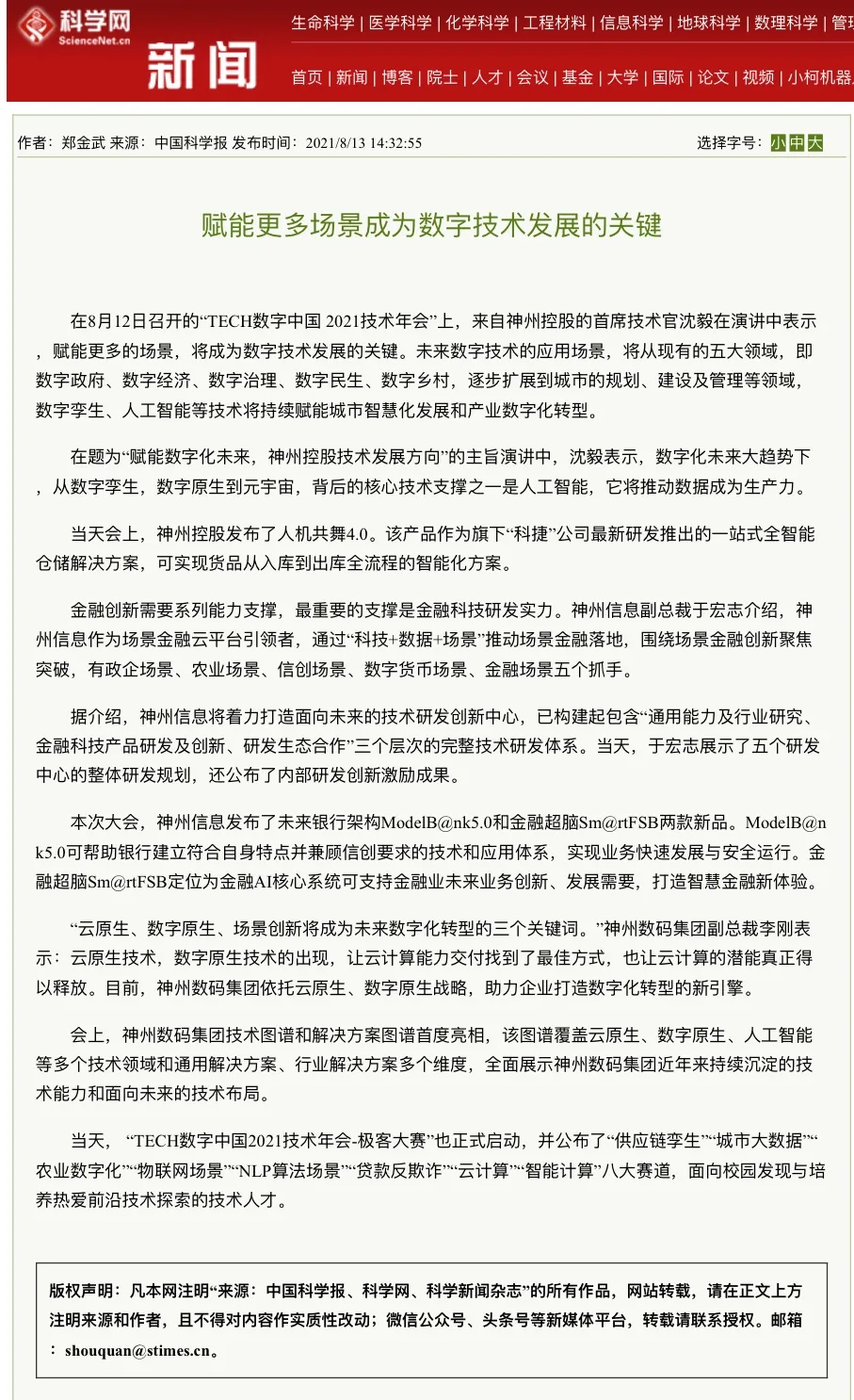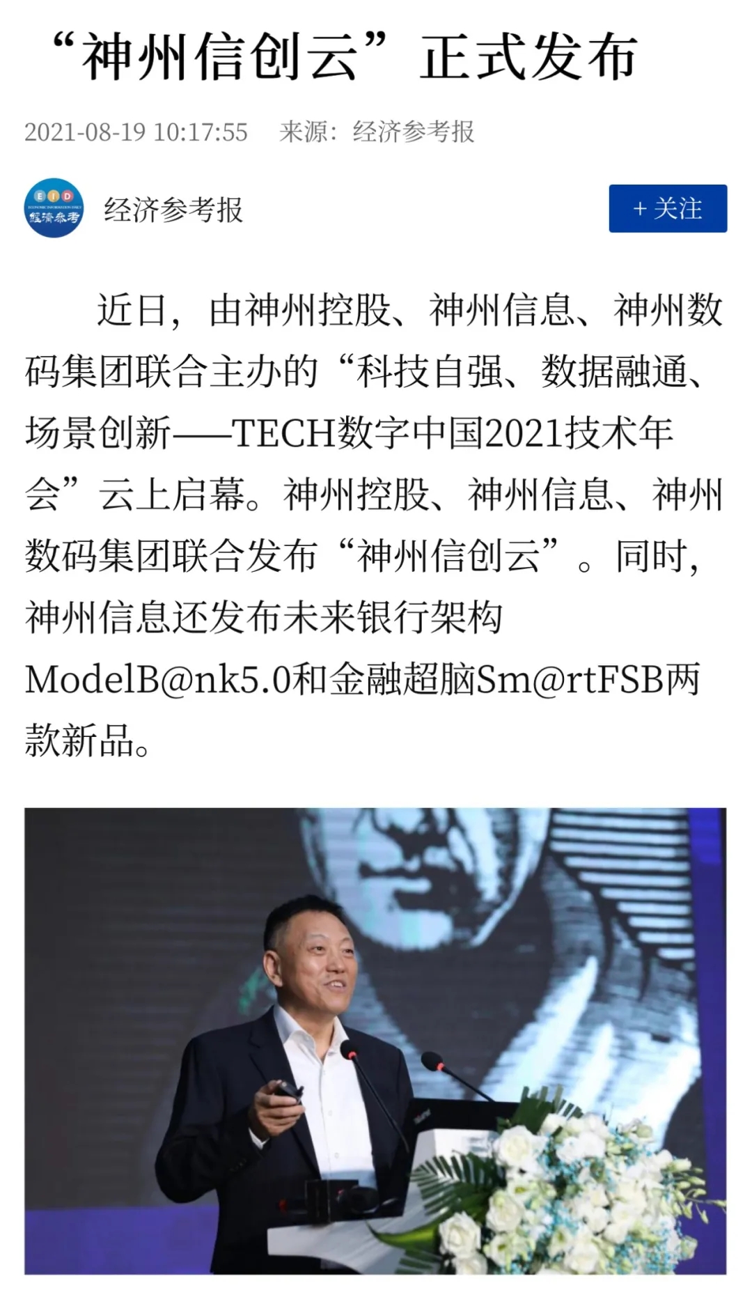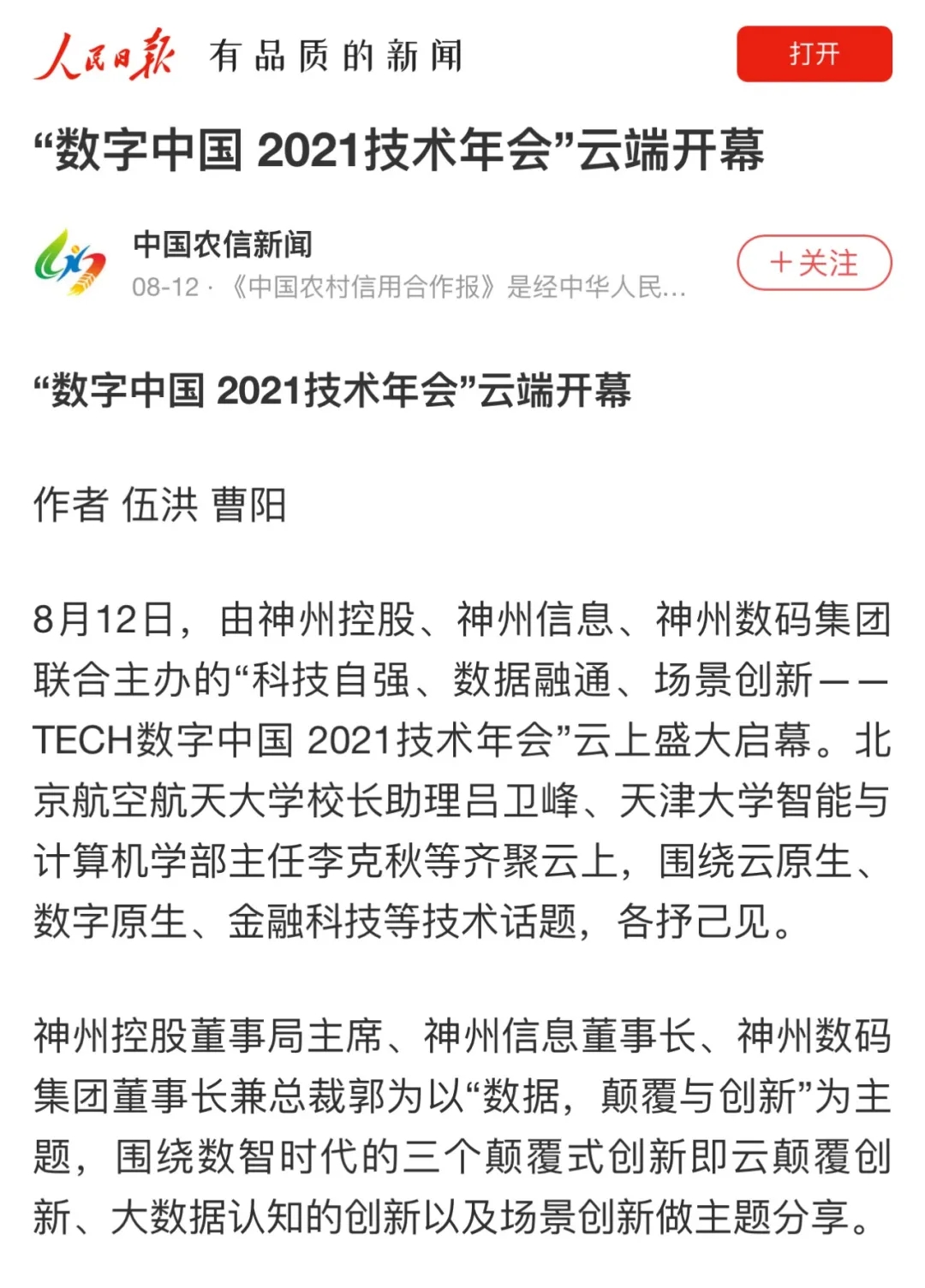 8月12日,由神州控股、神州信息、星空xingkong集团联合主办的“科技自强、数据融通、场景创新——TECH数字中国 2021技术年会”云上盛大启幕,发布神州信创云、ModelB@nk5.0、金融超脑Sm@rtFSB、云原生数字化安全底座、园区智能体等重磅产品,国内各大权威、影响力媒体多角度多频次对盛况进行报道!