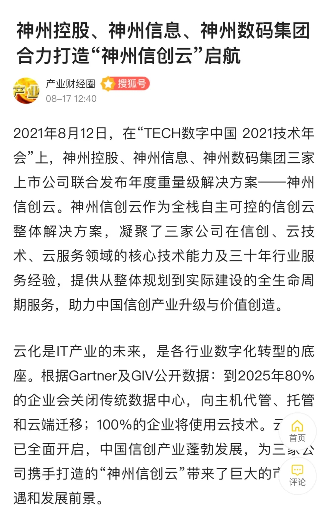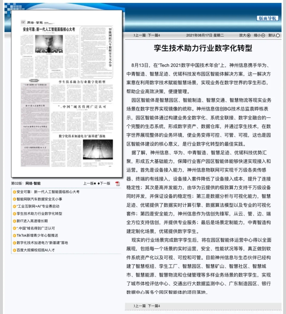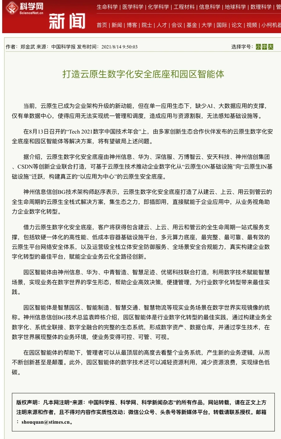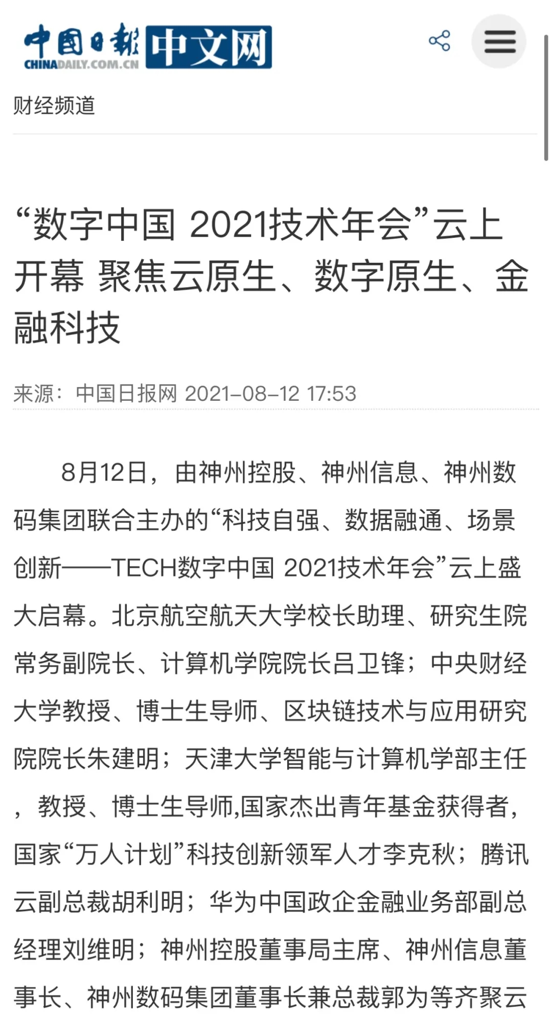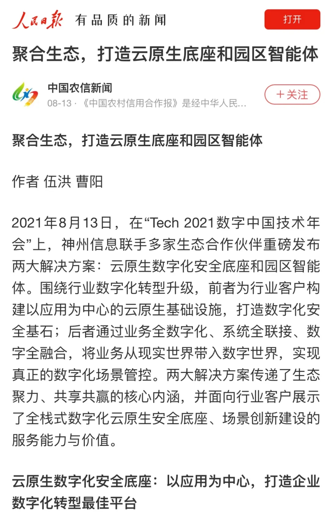 8月12日,由神州控股、神州信息、星空xingkong集团联合主办的“科技自强、数据融通、场景创新——TECH数字中国 2021技术年会”云上盛大启幕,发布神州信创云、ModelB@nk5.0、金融超脑Sm@rtFSB、云原生数字化安全底座、园区智能体等重磅产品,国内各大权威、影响力媒体多角度多频次对盛况进行报道!